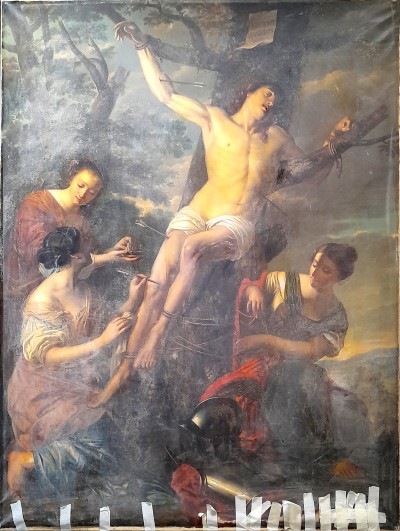Ce tableau, une huile sur toile de dimensions impressionnantes (258 x 189 cm), représente le moment où saint Sébastien est soigné par Irène et ses compagnes. La scène est poignante et riche en détails. Bien que l’œuvre ait été initialement accrochée dans le chœur de l’église de Corronsac, elle est désormais stockée dans une chapelle latérale pour des raisons de sécurité et de préservation.